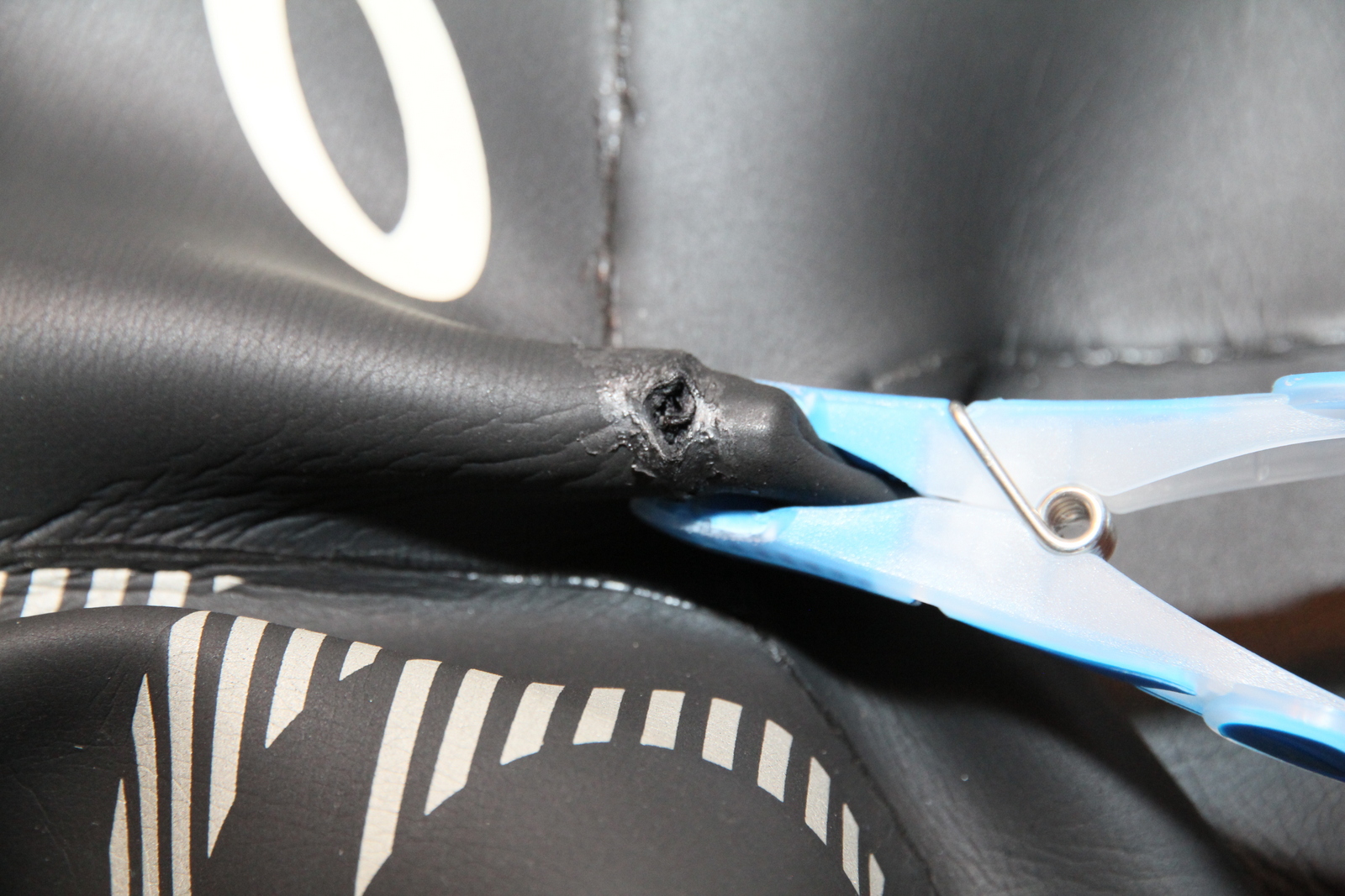 A ragasztandófelületeknek természetesen száraznak, zsírmentesnek kell lenni. Fontos, hogy pontosan a szétszakadt felületeket ragasztózzuk be. Ehhez szét kell húzni a neoprén anyagot a szakadásoknál, hogy jól hozzáférjünk. Én belülre egy filctollat tettem, erre kívülről ráfeszítettem a szakadásnál az anyagot és szárítócsipeszekkel rögzítettem.