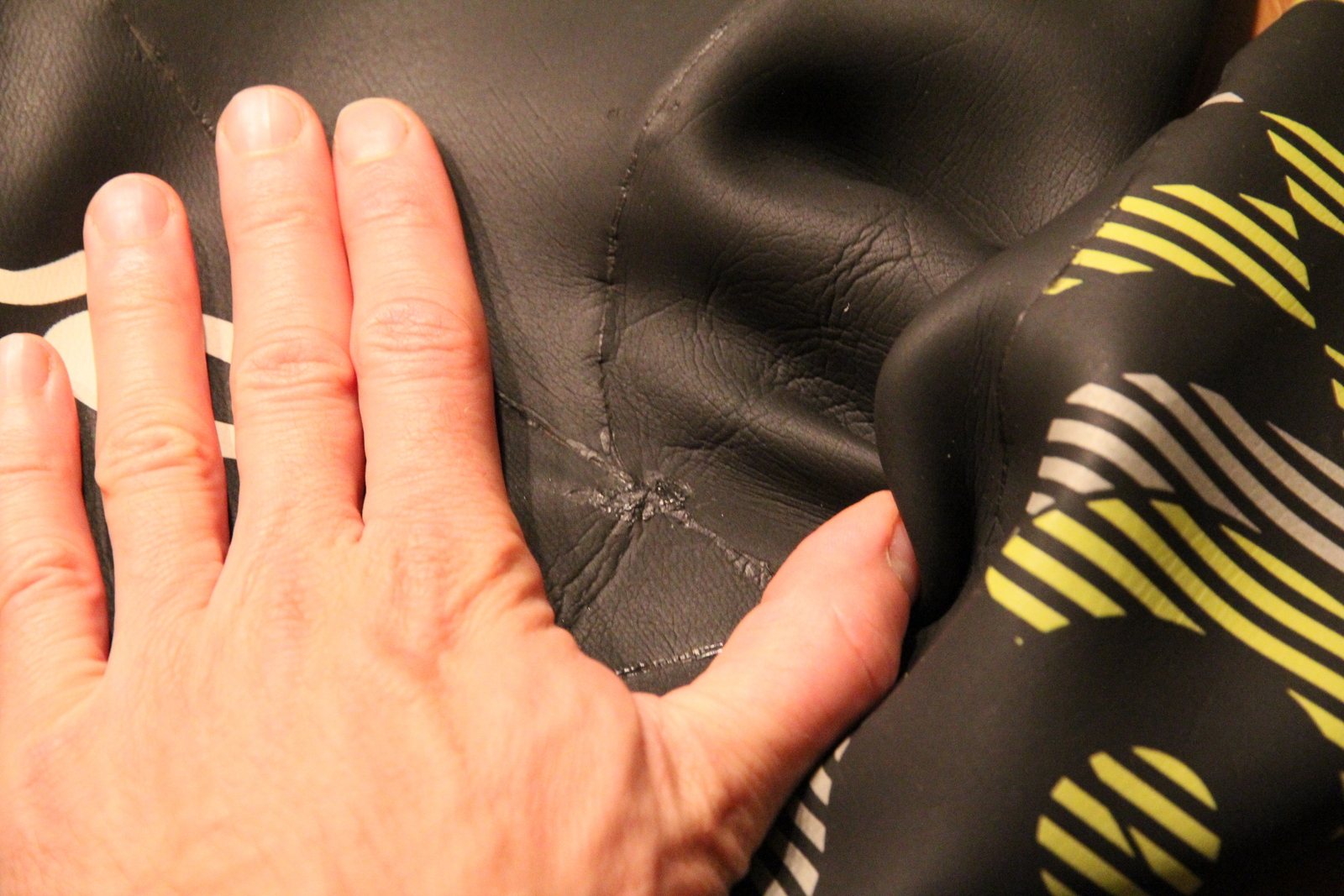 A ragasztandófelületeknek természetesen száraznak, zsírmentesnek kell lenni. Fontos, hogy pontosan a szétszakadt felületeket ragasztózzuk be. Ehhez szét kell húzni a neoprén anyagot a szakadásoknál, hogy jól hozzáférjünk. Én belülre egy filctollat tettem, erre kívülről ráfeszítettem a szakadásnál az anyagot és szárítócsipeszekkel rögzítettem.